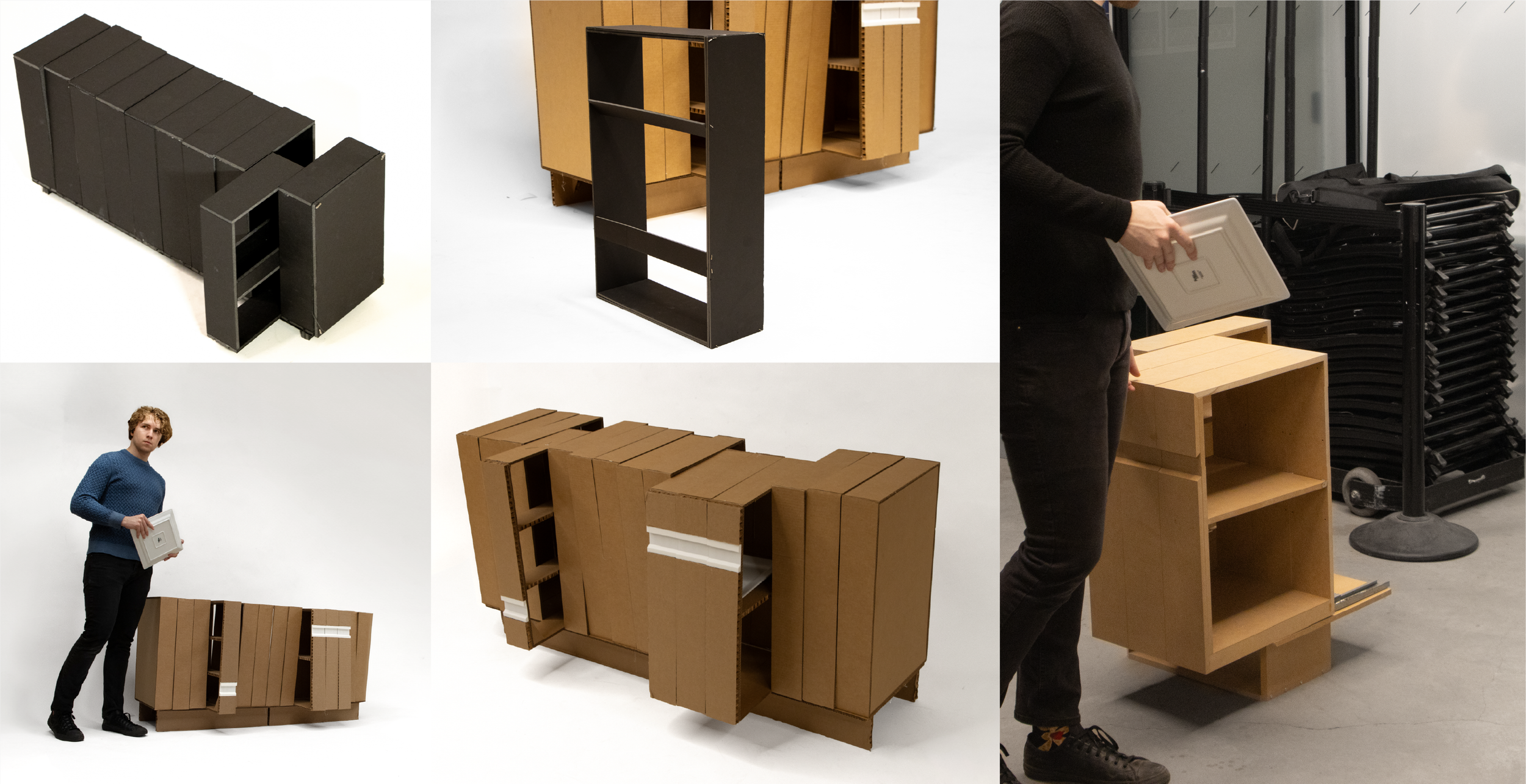 Near the end, I made a fully functional full-scale prototype of a segment (4 of 15 drawers) out of MDF, to test the undermount drawer mechanism and reconfigurable/combinable drawers, and what it would be like to use and interact with more broadly.