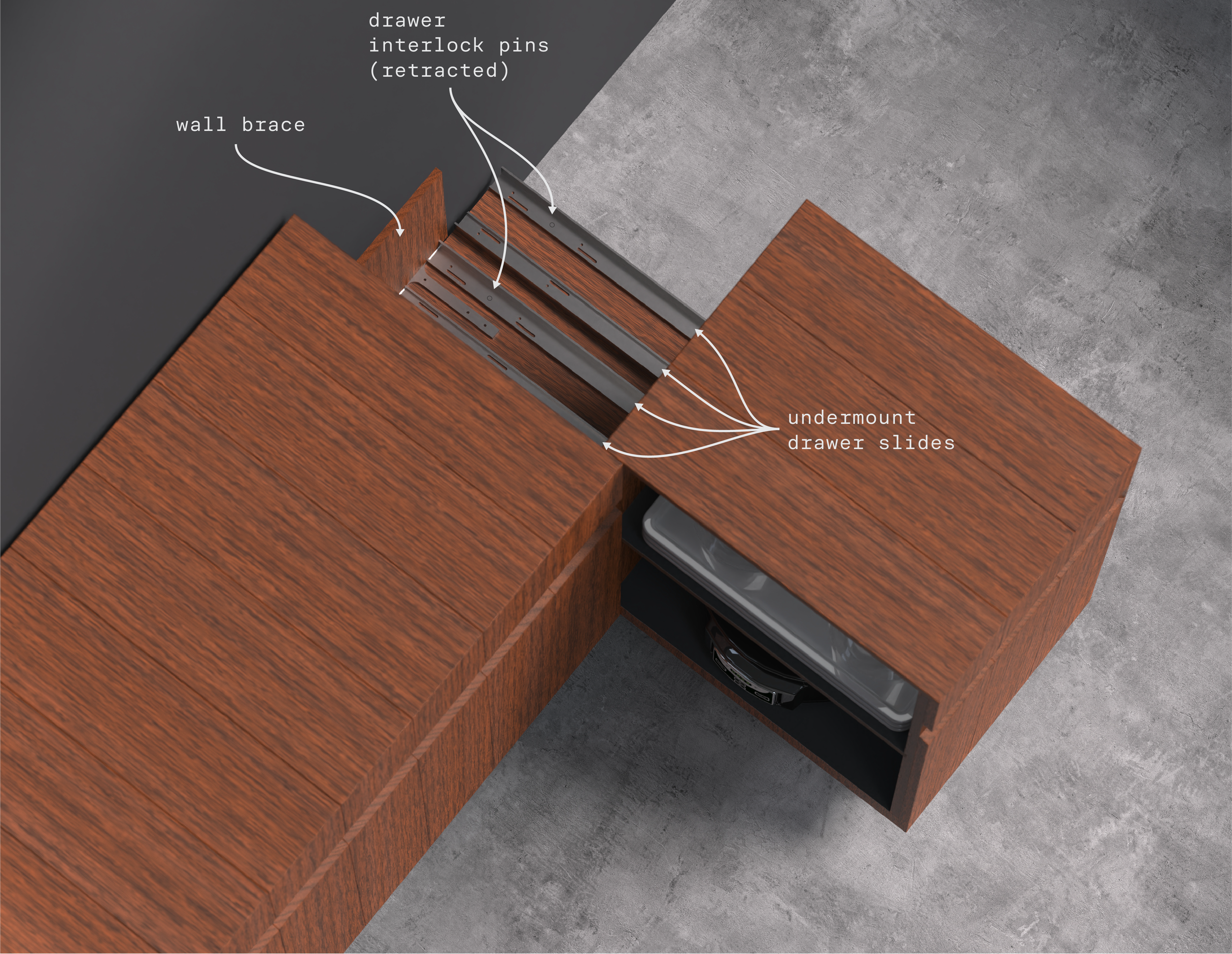 The drawer units are able to extend up to 17” from their flush resting position, so the entire interior can be easily accessed. To accommodate this structurally and mechanically, each drawer unit has a pair of undermount drawer slides (with damping on close, which was used in the functional prototype).