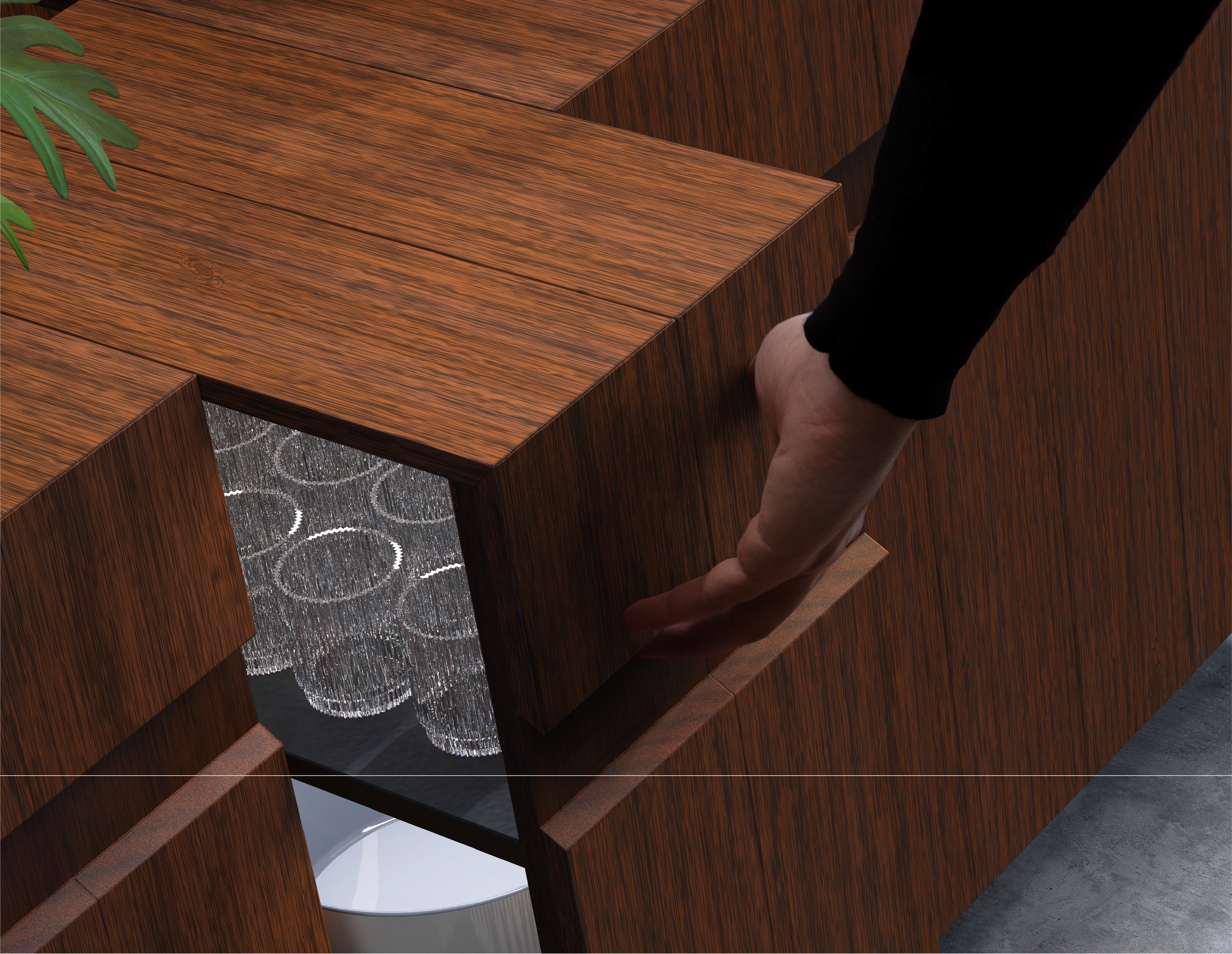 The drawers feature internal illumination when opened, which facilitates display and adds drama to the reveal of contained items, as well as improving the functional experience.